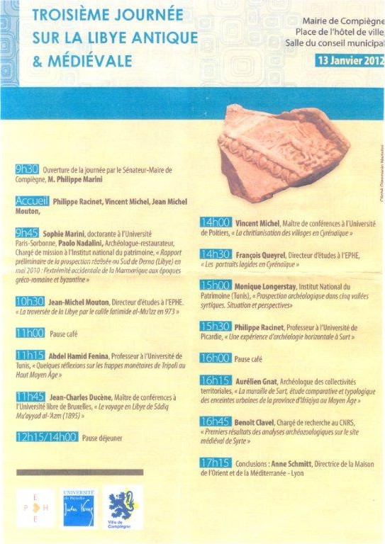 La Troisième Journée sur la Libye antique et médiévale, organisée par l'EPHE (Prof. J.-M. Mouton), l'Université Jules Verne d'Amiens et la ville de Compiègne,